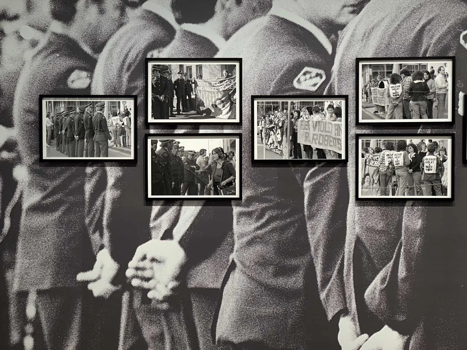 In 1980, Women Behind Bars, a courageous group of activists, campaigned for the prison release of Violet and Bruce Roberts, jailed for life after a short trial for the murder of Eric Roberts, Violet’s husband and Bruce’s father. They had endured years of domestic violence. Women Behind Bars used creative tactics to draw attention to the case, successfully campaigning for their release. Their conditional release was possible using the argument of provocation – a defence that is no longer admissable because it has since been used by perpetrators in defence of their actions (‘See what she made me do’). These photographs by Helen Grace documented the campaign, its dramas and its performativity. We can say that street art, actions, demonstrations are part of the history of performance art in a place – and in this case, many artists were involved, as well as the activists, putting their bodies on the line, risking arrest. Since 1980, protest laws have tightened and it is likely that the imaginative actions taken by the group in 1980 would not be allowed today. Every nine days a woman is killed by a current or former partner. Time itself serves as a form of developing agent, acting on the image, giving it even greater force in the present than it had in the past. And collective action has its own force and heroism, which always exists.
