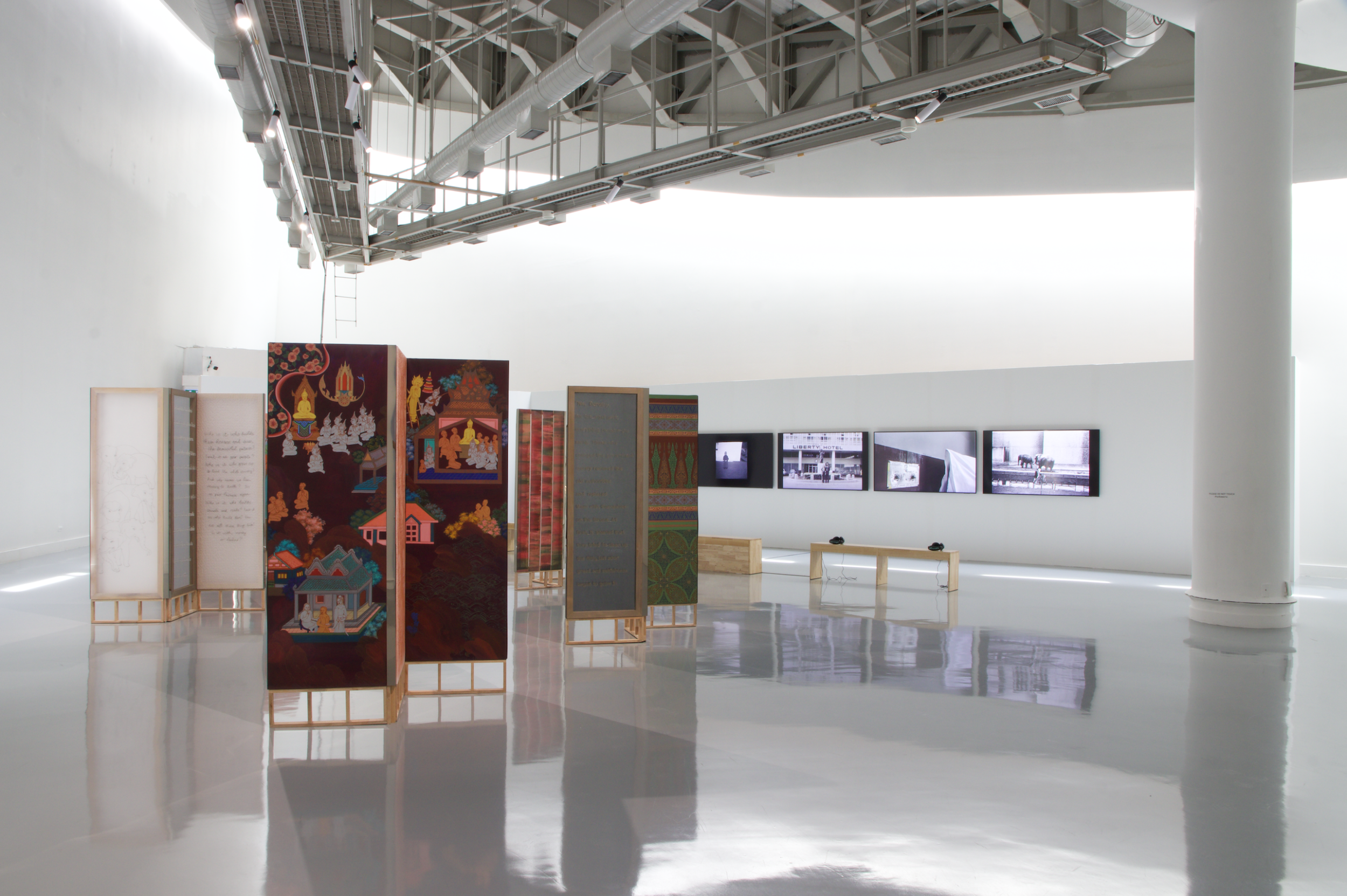 The installation draws partly on these spatial experiences and partly on the stories of small lived moments set beside world histories and regional histories, that span Thailand, Australia, Hong Kong, Vietnam, and Cambodia. The artists dream of borderless worlds, just before fear and darkness begin to obscure the openness they seek. This historical and panoramic narrative is realised through spatial composition – comprising video screens and painted screens.